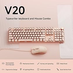 【Retro wired keyboard and mouse combo】:The typewriter gaming keyboard has mechanical custom pink switches that feature a smooth linear feeling, and low resistance without a tactile bump feel. round keycaps of the punk mechanical keyboard look like a classical typewriter.keycaps have a matte texture and upgraded touch feel and the sound is quiet when the button is pressed lightly giving you a comfortable typing feeling and a stable click touch. 【Multimedia & Backlight LED Control 】: gaming keyboard and mouse with a multimedia knob to control volume and light, This backlight LED keyboard has 19 lighting effects. Press “Fn+1~8” to choose the game backlight modes. 5 levels adjustable backlight brightness 【Mac/Win Wide Compatibility】:The wired keyboard is equipped with pink type-c cable lines,The type-c lines provide the computer gaming keyboard with more stable transmission to reduce latency and respond at high speeds. In addition, suitable with Windows 7/8/10/XP/Vista Linux and Mac OS systems,Press and hold "FN & TAB" at the same time to switch systems, no driver or software is required! 【Metal Panel and Electroplated Punk Keycaps】:The typewriter gaming keyboard panel is made of top-grade aluminium alloy, with a metallic matte texture, sturdy and robust enough to protect it from scratch. The floating keycaps are carefully crafted using metal plating technology, with a unique monochromatic light that instantly makes your keyboard look stunning, and enhances the feeling of the wired backlit keyboard. 【104 Keys Anti-Ghosting 】:This mechanical gaming keyboard adopts anti-ghosting technology for all keys. When multiple keys are pressed at the same time, the volume roller gaming keyboard can accurately identify each key operation, avoiding key conflicts and errors. The trouble of touching. Whether high-speed typing work or enjoy gaming, you can experience precise and smooth input. 【Wired Gaming Mouse】: As a plug-and-play wired mouse, easy to use.The gaming mouse runs flawlessly with an optical sensor. It has 7 buttons, can be set for more functions, and can adjust DPI 1200-2400 to provide precise cursor movements for game play, USB wired connection, and plug and play! No drivers or software required.