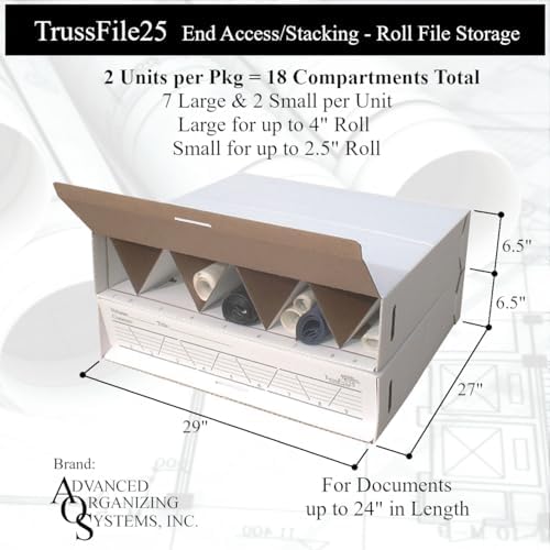 TrussFile25 (2 Pack) - Stores rolled items up to 24” in length. By Advanced Organizing Systems, Inc. Economical solution for organizing plans, maps graphics and all other rolled items in office/home or permanent storage. Trussed interior with exceptional stacking strength is designed to be used horizontally with end access for easy retrieval when stacked. Single unit can be used vertically. Attractive corrugated cardboard with gray lettering on white background. Side handles and labeled integral end flap for easy identification and organization. 7 large and 2 small triangular compartments per unit (2 units/pkg–18 compartments total). Large compartment stores up to a 4″ roll or a multiple of smaller rolls. Small compartment stores up to a 2.5″ roll. MADE IN USA, USA Customer Support