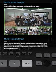 【Rich and Flexible Input Interfaces】Equipped with 4 x 3G-SDI ports and 4 x HDMI ports, a total of 8 inputs can be selected, of which HDMI 1 and 2 support 4K input. Support NDI input (optional), and multi-functional input ports for direct connection to USB devices for media playback, access to UVC cameras, and support for SRT and RTMP streams. 【Multiple Outputs and Monitoring Functions】With dual HDMI outputs and 1 x SDI output, it supports independent outputs of PGM and MV, and can connect three display terminals at the same time to meet the needs of multi-view monitoring. 【Convenient Live Streaming and Recording】Built-in hardware live streaming engine allows direct streaming to TikTok, Instagram and other platforms via Ethernet without a computer. Supports recording live audio and video directly to USB drive or external hard disk. 【Powerful Media Processing】Built-in media player can play videos from storage devices as input source. Supports importing JPG and PNG images from USB drives, and the lower-third dynamic overlay feature enriches visual effects. 【Professional audio and video processing】Equipped with a professional audio mixer that supports AFV and MIX audio modes, it can mix HDMI embedded audio and external audio sources in real time, and realize real-time audio monitoring through the headphone jack. Equipped with virtual chroma key algorithm to help news broadcasting and live demonstration. 【Precise PTZ Camera Control】Supports up to four PTZ cameras for smooth multi-camera switching via joystick.