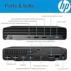 - Operating system Windows 11 ProProcessor 12th Gen Intel Core i5-12500T (18 MB cache, 6 cores, 12 threads, 2.00 GHz to 4.40 GHz Turbo).Chipset Intel Q670Graphics Integrated Intel UHD 770 GraphicsMemory 16GB DDR4 RAMHard drive 512GB PCIe NVMe TLC SSDWireless technology Wi-Fi 6 (2x2) and Bluetooth comboPower supply 90 W external power adapter, up to 89% efficiency, active PFCExternal I/O PortsFront: 1 headphone/microphone combo; 1 SuperSpeed USB Type-A 10Gbps signaling rate; 1 SuperSpeed USB Type-A 10Gbps signaling rate (charging); 1 SuperSpeed USB Type-C 20Gbps signaling rateRear: 1 power connector; 1 RJ-45; 1 SuperSpeed USB Type-A 10Gbps signaling rate; 1 SuperSpeed USB Type-C 20Gbps signaling rate; 2 SuperSpeed USB Type-A 5Gbps signaling rate; 2 DisplayPort 1.4; 1 HDMI 2.1Form factor MiniPointing device HP 125 Wired MouseKeyboard HP 125 Wired KeyboardDimensions (W X D X H) 6.97 x 6.89 x 1.34 inWeight 3.13 lb