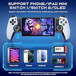 【NEVER EXPERIENCE STICK DRIFT AGAIN】Experience precise control that lasts. Our magnetic Hall sensor joysticks eliminate drift, ensuring smooth aiming and movement even after months of gameplay 【ONE CONTROLLER, ALL YOUR DEVICES】Works seamlessly with iPhone, Android, Switch (1/2/OLED), iPad Mini, Steam Link, GeForce Now, Xbox Cloud Gaming, Roblox, and most mobile games via Bluetooth 【HALL JOYSTICK GAME CONTROLLER FOR IPHONE】 The Hall effect joystick provide ultra precise control, No drift, No deadzone! It helps you gain dominant position of games faster and the performance and game experience has been improved qualitatively 【PRO GAMING FEATURES】Includes programmable back buttons (M1/M2) for custom macros, turbo function, 6-axis gyro, vibration feedback, and RGB lighting—perfect for competitive mobile gaming 【LONG BATTERY & PORTABLE】Up to 14 hours on a single charge. The telescopic design stretches to fit most phones (4.13-7.87inch), making it your perfect on-the-go gaming companion 【TIPS FOR MC500】①On Switch2: C-Button Voice Menu are not supported. When attaching the controller to the Switch 2, please ensure it is properly aligned and fully snapped into place. Avoid applying pressure if misaligned to prevent bending the side contacts. ② This product is not compatible with PlayStation consoles. Does not work with PlayStation Remote Play