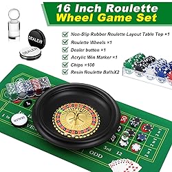 Product Package: this roulette wheel game set offers an all inclusive gaming experience right at your fingertips; It boasts a package that includes a black roulette wheel with 2 balls, a green rubber anti slip tabletop mat with a storage bag, a casino dealer button, a roulette win marker, and 100 game chips; Now you can enjoy a casino like experience effortlessly in the comfort of your home or anywhere on the go Portable Size: this roulette wheel set is designed with travel convenience in mind; The 16 inches/ 40.6 cm diameter roulette wheel and the 35 x 16 inches/ 90 x 40 cm green casino layout mat are compactly sized; The materials' 2 millimeter thickness makes the set portable, easy to carry, and suitable for outdoor games, enhancing your gaming experience further by allowing flexibility in gaming locations Material Quality: our roulette set stands out significantly due to the materials employed in its construction; The green casino mat is made from rubber material that prevents slipping, and the roulette wheel is crafted from plastic; These materials assure a look and a comforting touch that heightens your overall gaming experience Wide Application: this roulette game set is not only a game but also an entertaining tool that brings joy in a variety of scenarios; It can be utilized in family gatherings, parties, casinos, or simply as an appropriate method to while away the time on a slow afternoon; Its portable design and uncomplicated setup make our roulette wheel game set applicable and fun for everyone Classy Gift: if you're searching for a present that enthuses both adults, your search ends here; Our roulette wheel set is thoughtfully packaged and presents an gift for those who enjoy games of chance and skill; It's not just a product; It's a delightful experience wrapped up in an elegant package