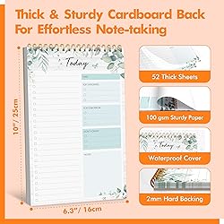 - Gethelud is an experienced early educational tools supplies producer and aiming to provide the best quality and user experience. 52 Sheets Notepad: This to-do list notepad includes 52 undated sheets - perfect for daily use without the pressure of specific dates. Whether you’re organizing your tasks, managing schoolwork, or outlining office projects, this planner gives you plenty of pages to stay on track and in control. Ideal for tracking goals, habits, appointments, or assignments. Spiral Coil Design: This planner features a sturdy spiral coil binding, which is easy to flip open and lays flat for a comfortable writing experience. The convenient tear-off design makes it a breeze to remove completed pages without damaging the rest of your notebook—perfect for quick updates and a fresh start each day. Enough Writing Space: It measures 10" x 6.3", providing ample space to list your daily goals, appointments, and reminders without feeling cramped. Whether you're a minimalist planner or a detail lover, there's room for everything that matters. Premium Quality: It is made of thick paper, which can handle pens, markers, and highlighters effortlessly - no smudges or ink bleeding through. It also features a transparent waterproof cover and a hard cardboard backing. Whether you’re jotting things down at a desk or on the go, it offers a smooth and sturdy writing experience. Easy to Use: This productivity pad encourages planning and goal setting, designed to help you focus and prioritize. With the top 3 priorities, for tomorrow, and don't forget sections, you’ll find it easier to manage time, reduce stress, and boost your efficiency—one task at a time.