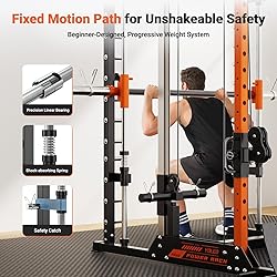 【Independent Dual-Pulley System for Multi-Target Training】Our Smith Machine home gym system revolutionizes training with dual 2:1 ratio pulley systems, featuring 4 fixed pulleys and 1 dynamic pulley per side. This engineering marvel delivers silky-smooth independent resistance for lat pulldowns, seated rows, and precision glute sculpting. The anti-shock dynamic pulley technology makes it ideal for both power cage enthusiasts and Smith Machine users seeking quiet, tension-perfect workouts. 【Unmatched Safety & 1700LB Heavy-Duty Construction】Engineered for serious lifters, our power cage home gym solution boasts reinforced 2mm steel and 4 widened base plates. The hybrid design combines Smith Machine safety catches with power racks-inspired J-hooks, creating the ultimate safeguard system for 1700lbs lifts. Experience commercial durability in your home gym with crash-tested safety arms and buffer circles. 【21 Adjustable Heights & Versatile Accessories】Transform your power cage into a complete fitness hub with 21 adjustment holes accommodating Olympic lifts and cable crossovers. Our power racks for home gym compatibility shines with 12+ pro accessories including multi-function T-bars and 360° rotating landmine tube. Master compound lifts and isolation moves with commercial-grade dip bars and LAT pulldown attachments. 【Women-Centric Glute & Core Sculpting】Specially engineered for modern fitness goals, this Smith Machine hybrid enables targeted hip thrusts and incline bench press with fixed barbell paths. The dual pulley system's low-resistance mode pairs perfectly with power cage home gym versatility, while shock-absorbing rails support high-rep glute burnouts. Achieve competition-ready curves through biomechanically optimized cable paths unseen in standard power racks. 【Space-Efficient Design with Ergonomic Upgrades】Maximize small spaces with our Smith Machine home gym's optimized 18.4 sq.ft footprint. The linear guide rail system enhances traditional power cage functionality with buttery-smooth barbell motion. Extended 17.7" safety arms and reinforced steel t-plate splints deliver power racks-level stability in compact home setups.