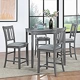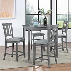 - 5-Piece Counter Height Dining Table Set, Square Wooden Table with 4 Upholstered Chairs, Small Space Dining Set, GrayUpgrade your dining space with this 5-piece counter height dining table set, perfect for small spaces. Featuring a sleek gray finish and a solid wood design, this set includes a square table and four comfortable upholstered chairs. Its compact design makes it ideal for kitchens, dining rooms, or apartments while providing a sophisticated, modern touch to any space.Key Features:Elegant Design: This dining set features a spacious square table with elongated tapered base legs, offering a balance of elegance and simplicity. The smooth surface is waterproof and easy to maintain, perfect for everyday use.Space-Saving & Functional: The compact size makes this set perfect for small spaces. After meals, you can tuck the chairs under the table to create more room, making it ideal for limited spaces.Durable Construction: Crafted with high-quality MDF and birch veneer for the tabletop, and solid acacia wood for the frame and legs, this set is designed to last. It’s built to withstand daily use, supporting up to 330 lbs for both the table and chairs.Comfortable Seating: The chairs are upholstered with breathable linen fabric and feature foam-filled cushions for added comfort. The sturdy slatted backrest provides support, and the ergonomic design ensures a relaxing dining experience.Easy Assembly: With clear instructions and streamlined design, assembly is quick and simple. The set is delivered in two separate boxes for convenient handling.Product Specifications:Table Dimensions: 34.5” L x 34.5” W x 36” HChair Dimensions: 17” W x 21” D x 40” H, Seat Depth: 16.4”, Seat Height: 23.8”Material: Table: Acacia Wood, MDF, Birch Veneer; Chairs: Rubber Wood, Acacia Wood, Bent Wood, LinenWeight Capacity: Table: 330 lbs; Chair: 330 lbs per chairColor: GrayNumber of Packages: 2 boxesAssembly Required: Yes (Assembly instructions included)Place of Origin: VietnamPerfect For:Dining Rooms: This set brings a modern and sophisticated touch to any dining room.Kitchens and Small Spaces: The compact design is ideal for kitchens or apartments with limited space.Casual Gatherings: The comfortable chairs and durable table are perfect for family meals or entertaining guests.Note: Due to lighting or screen settings, the color may vary slightly from what you see on your screen. Easy assembly required with included instructions.