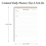 - This to do list planner is size of 5.5" x 8.3", with 50 sheets/100 pages per pack, total in 250 sheets/500 pages for 500 days, improve your productivity with this daily organizer. Daily planner notepad is undated, used to high quality 100gsm pure white premium acid-free paper, so you can confidently use most pens, pencils, and markers without ghosting and bleed-through.The waterproof PVC front cover provides good protection for this daily notepad, while the hard back base can give you a better writing experience, and the twin-wire bingding design makes it so it won't leave traces when you tear off the completed plan pages. This to do list pad for work,home, school notes, meeting notes, or any form of writing, or also simply to list things you want to do. this office desk accessory is also a practical addition to school supplies. Suitable for students, professionals, and homemakers alike, it helps keep tasks and priorities in check effortlessly.