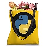 novelty Python Programming Language Logo for anybody who loves Python. Python is powerful... and fast; plays well with others;r uns everywhere; is friendly & easy to learn; is Open. 16” x 16” bag with two 14” long and 1” wide black cotton webbing strap handles. Made of a lightweight, spun polyester canvas-like fabric. All seams and stress points are double-stitched for durability, and the reinforced bottom flattens to fit more items and hold larger objects. Spot clean/dry clean only.