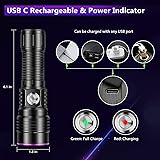 - UV Flashlight 365nm Rechargeable Black Lights Made of 4-core 365NM UV LED bead, 20W high power, real invisible uv light that is not dazzling. When it irradiates items containing fluorescent agents, security code or watermark, it will show obvious blue-violet light. High Powed Ultraviolet Flashlight Black light flashlight powerful has 2 lighting modes: High Mode, Medium Mode. but blacklight flashlight features stepless dimmable function, you can long press switch to increase or decrease brightness. USB C Rechargeable Black Light with Power Display Powered by rechargeable battery, with 5 hours battery life. You can use the included USB-C charging cable and take 3 hours to fully charge. Power Indicator automatically turns to red light to remind you to charge in time, avoid the hassle of unexpected shutdown. UV Flashlights Used in All Areas of Life uv flashlight pet urine detector uv light for resin curing scorpion light pet urine detector light blood tracking light for hunting black light for uranium glass cat urine detector uranium glass flashlight ac uv light uv light for bed bugs