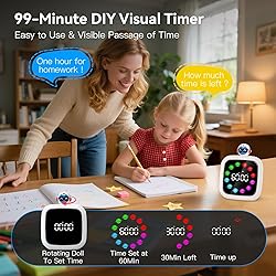 Upgraded Visual Timer: It is a visual timer that combines digital and visual elements. Precise timing. You can see the passage of time through the reduction of color blocks vividly and intuitively. Rotating the cute doll's head to set the time. Easy use for kids and adults. This timer supports up to 99 minutes Rechargeable Timer: The digital countdown timer can operate for at least 25 hours, meeting your daily needs. You don't need to change the battery or charge it frequently Pause and Continue Time, Memory Function: During the timing process, you can pause and resume timing at any time. This Pomodoro timer saves the time you set last time automatically. No need to repeatedly set the time 9 Optional Color Displays and Custom Color Display: There are 9 different color displays for you to select. If you want more display color styles, there is a DIY function. 12 display color blocks can be edited to different colors to create new displays 19 Music Alarms and 4 Optional Volumes: The kids timer has 4 volumes, mute, low, medium, and loud. It is built with 19 ringtones, including pleasant light music, white noise, and traditional alarm, satisfying people with different listening preferences Improve Time Management Skill: Farewell to procrastination and improve efficiency. This fun timer is suitable for study, work, classroom, kitchen cooking, etc.. It can help you effectively manage your time. Suitable for children and adults. ATTENTION! To keep the use convenient, this timer can only be adjusted in minutes, not seconds