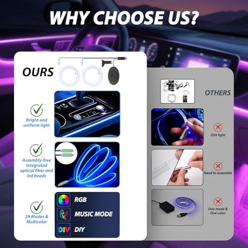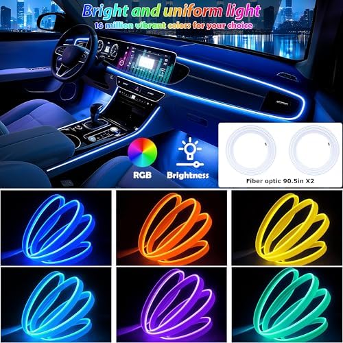 - [2025 Upgraded Version,Super Easy to Install]:The optical fiber of interior car lights has been pre-installed, and it can be directly inserted into the gap of the center console, and the operation is simple. Car led lights with USB plugs, plug and play, save more time. The auto interior lights suitable for RVs, camping cars, trailers, cars, trucks, SUVs, ATVs, boats, golf carts, etc.
