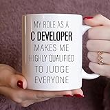 [Perfect Gift For C Developer Professionals]: Honor a C Developer’s expertise with this 11oz white ceramic mug featuring the humorous quote - My Role As a C Developer Makes Me Highly Qualified To Judge Everyone. Ideal for work or gifting. [Durable Ceramic Design]: Crafted from premium white ceramic, this 11oz mug is microwave-safe and dishwasher-safe, perfect for daily coffee or tea in any workplace. [Comfortable Size For Workdays]: With an 11oz capacity, this mug fits seamlessly in an office or home setting, designed with a sturdy handle for C Developer enthusiasts. [Long-Lasting Vibrant Print]: The witty quote is printed on both sides using advanced sublimation technology, ensuring the design remains bold and fade-resistant over time. [Versatile Gift For Any Profession]: A thoughtful present for C Developers, coworkers, or friends, suitable for birthdays, holidays, or to celebrate their leadership across various careers.