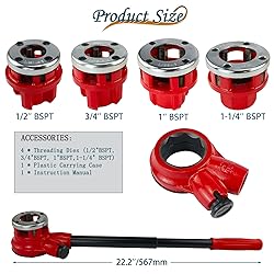 Versatile Sizing – Includes BSPT1/2", 3/4", 1" ,and 1-1/4" dies to handle a wide range of BSPT threading tasks with ease. Durable Construction – Built from high-strength steel for exceptional hardness, ensuring reliable performance and long-lasting use. Ergonomic Design – Features a long, comfortable handle that maximizes torque and makes pipe threading smoother and more efficient. Wide Application – Perfect for cutting, threading, and repairing pipe threads, offering a complete solution for professional and DIY plumbing projects. Portable Storage – Comes with a durable plastic carrying case for easy transport and organized storage, making it ideal for job sites and home projects.