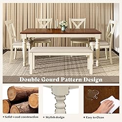 【Dining Table Set for 6】 This 71" rectangular dining table set includes 4 upholstered chairs and a matching bench—offering comfortable seating for 6. The generous 71"L x 36"W tabletop provides ample space for dinners, gatherings, or everyday use, making it a stylish and practical centerpiece for any rustic dining room 【Elegant Farmhouse Design】 Crafted with graceful double gourd-shaped legs, this farmhouse dining table blends timeless elegance with rustic charm. The sculpted base showcases fine woodworking craftsmanship, turning the table into a refined statement piece for any dining room 【Premium Solid Wood Tabletop】 The table features a thick, solid wood top with a rich natural wood grain finish, offering both visual warmth and organic texture. This solid wood dining table is built for long-term durability, making it as strong as it is stylish 【Comfortable & Versatile】 This dining set includes 4 cushioned chairs with ergonomically curved backrests and a matching dining bench, providing comfort and seating for up to six people, perfect for family dinners, gatherings or everyday meals 【Easy Assembly】 All parts are clearly labeled and included with premium hardware and a step-by-step manual, making setup quick and hassle-free—typically completed in under 45 minutes without extra tools