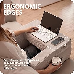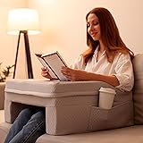 Includes 2 pillowcases: Unlike other lap desk pillows, ours comes with an extra washable pillowcase so you can swap or wash covers anytime; uphold cleanliness for your laptop pillow setup. Expanded 16″ leg spacing between pillow supports: Unlike standard lap pillows with 12–14″ gaps, our reading pillow provides a generous 16" distance between its side supports, allowing your laps to fit comfortably underneath. Flat design: Flat top keeps your device from sliding off, unlike angled lap pillow desk models. It also helps you sit more comfortably by keeping your back straight and arms relaxed during long working or gaming lap desk sessions. Extra surface area: The expanded 24" laptop pillow surface accommodates your laptop, phone, book, and mouse, transforming it into a versatile couch desk for laptop, lap pillow for reading, or gaming. More Stability: Oversized support ribs distribute weight evenly, resisting sagging and keeping your bed pillow sturdy during long use. Convenient side pockets & premium foam: Store your phone, charger, or notepad in the side pockets. Made with high-density foam and a durable cover that outlasts other reading pillows.