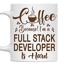- Funny Full Stack Developer Mug - 11oz White Ceramic Personalized Gift for Full Stack DeveloperLooking for a hilarious gift for a hardworking Full Stack Developer? Our 11oz white ceramic mug features the witty quote: Coffee, Because! I'm a Full Stack Developer Is Hard, making it the perfect companion for any Full Stack Developer who needs their daily dose of coffee to tackle their demanding job. Whether they’re sipping coffee, tea, or any beverage, this mug is sure to bring a smile to their face with every use.Why Choose Our Mug? ● Premium Quality: Made from durable white ceramic, this mug is both microwave and dishwasher safe, ensuring long-lasting use and easy maintenance. ● Perfect Size: With an 11oz capacity, it’s ideal for daily use at home, the office, or on the go—wherever your Full Stack Developer needs a caffeine fix. ● Thoughtful Gift Idea: A fantastic gift for birthdays, holidays, or just to show appreciation for their hard work as a Full Stack Developer. ● Made in the USA: Designed and printed in the USA with vibrant, fade-resistant prints that reflect the resilience of every Full Stack Developer.Add a touch of humor to your Full Stack Developer’s day with this personalized mug! Order now and make their coffee breaks more enjoyable.