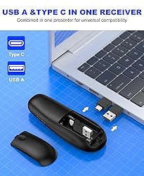 【BT & RF 2.4 GHz dual modes clicker for presentations】This presenter can quickly switch between BT and RF 2.4GHz modes with a single button,compatible with various Bluetooth-enabled laptops and desktop computers.(Please note that this presenter has no power button. It automatically enters sleep mode after 30 seconds of inactivity to conserve energy - simply press any button to wake it) 【Plug & Play USB A & C Presentation Clicker】Equipped with dual USB-A/USB-C connectors, combined in one presenter for universal compatibility. Ergonomics design and large rubber buttons makes comfortable hold feeling and easily using. Bumped-buttons design for operating without looking down at it 【Multi-featured Presentation Pointer】The powerpoint remot offers all the essential functions like page forward/backward and full/black screen. Additionally, it includes extra features such as volume control, hyperlink activation, and window switching. With these capabilities, you can effortlessly present and control your computer 【Long Control Wireless Range】Enjoy a maximum wireless control range of 164FT. This allows you to freely move around the room without any limitations from your computer, ensuring a seamless presentation experience. With bright laser light, you can highlight the key areas of the slide to attract the attention of the audience 【More Details】The receiver is conveniently stored next to the battery compartment, making it easy to carry. (2 AAA batteries are required but not included) Our pointer for presentations making it an easy-to-use tool for all your basic presentation needs. Whether you're a student, teacher, or business professional, this clicker will help make your presentations more engaging