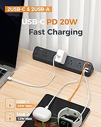 Desk Clamp-on Design: This desk mount power strip securely mounts to desktops, under desks, or table legs (fits max thickness up to 2 inches), keeping this flat outlet extender stable and providing easy access to charging for your devices 9 in 1 Desk Power Strip: This power strip with surge protection can turn 1 socket into 5 AC outlets (1250W Max) and 4 USB ports, charge 9 devices simultaneously without blocking; Extension cord with usb ports suitable for various indoor spaces 2100J Power Strip With Surge Protection: Features overload protection, short-circuit protection, and over-current protection; The on/off switch automatically shuts off when protections are triggered, safeguarding your devices during charging 20W USB C Fast Charging: The power strip with usb ports features 2 USB C and 2 USB A; USB C delivers to 20W max, can quickly charge your phone, reducing waiting time; USB A is 12W max per port, meeting the charging needs of various USB devices 6 FT Flat Extension Cord: With only 0.35 in ultra thin flat head design, flat plug power strip can easily fit in tight spots and hide behind sofa, bed or other furniture; 45° right angle design create an extra space for other plug below without blocking