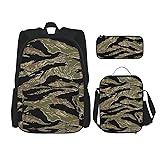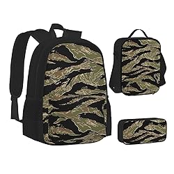 - The most comfortable Tiger Stripe Camo Print backpack with lunch bag and pencil case. Ergonomic design and padded shoulder strap, adjustable mesh padded shoulder straps and soft mesh back panel give more breathable, ventilation, heat dissipation that support carrying the backpack.This Set Offers Ample Storage Space With Multiple Compartments For Better Organization.