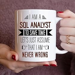 - Whether you're a Sql Analyst tackling challenges or just surviving Monday meetings, this mug understands you. The: I Am a Sql Analyst To Save Time Let's Just Assume That I Am Never Wrong. Design brings a smile with every sip. It's the ultimate companion for busy professionals who rely on a good cup of coffee to get through the day.This high-quality 11oz white ceramic mug is microwave and dishwasher safe, making it as practical as it is entertaining. Whether you're treating yourself, thanking a coworker, or surprising a friend, this mug makes a perfect gift for birthdays, office events, or appreciation days.Makes a great gift for birthdays, holidays, or a little pick-me-up for yourself or a coworker!Your satisfaction matters – If there’s any issue with your order, we’re here to help.