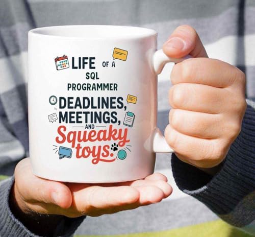 Humorous Gift Idea Funny Gift for a Sql Programmer, Pet Lovers, Life of a Sql Programmer Deadlines, Meetings, and Squeaky Toys 11 Oz White Ceramic Coffee Mug