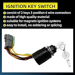- Fitment: The ignition Switch with Key designed specifically for Tracker Boats, and it used for Mercury Marine Outboard Engine Control Box Part Number: The ignition key switch with harness repalce part number is 129572 Features: The ignition key switch consisted of 2 Keys 3 Position 6 Wire Connectors. The iginition switch is suitable for Magneto ignition systems, easy to install, no soldering or splicing Performence: The ignition key switch has excellent performence; It features a three-position design (Off-Ignition-Start) and incorporates a manual push-button choke function to facilitate cold engine starting by enriching the air-fuel mixture Package Include:1X Ignition Key Switch with Key, 1X Wire Connector Adapter