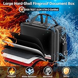 - Tamfile Fireproof Document Box with Lock, Hard Case Fireproof Water Resistant File Organizer with 24 Colorful Pockets,Fire Safe Box for Important Documents、Valuables、Laptop、Passports (Black) [Enhanced version UL-94 VTM-0 Certified Hard Shell Fireproof Document Box]Constructed with multi-layer non-itchy silicone-coated fiberglass, thickened fireproof layers, and a rigid hard shell, 8 layers of materials to build a safe and fireproof structure, this box is SGS(UL-94 VTM-0) certified to withstand extreme heat, . It offers reliable protection for documents, electronics, and valuables, ensuring safety in fire emergencies. [All-Round Secure & Portable Protection File Box]This hard-shell organizer combines fireproof, water-resistant, and dust-proof protection to safeguard documents from fire, flooding, and humidity. Featuring metal zippers, and reinforced seams, it ensures secure storage. The detachable shoulder strap and sturdy handle make it easy to carry and suitable for travel, home and emergency use, combining strong security and daily convenience. [Large Capacity & Multi-Compartment Fireproof File Box] With external dimensions of 15.7 x 11.8 x 6.9 inches and a thoughtfully organized interior— 24 Colorful pocket folder, 1 main pocket, 2 folding pockets, 20 card slots, 4 pen slots, 1 X-shaped pocket, 3 mesh pockets—this fireproof box securely stores, passports, valuables, files, money, passport, U Disk, cards, laptop, certificates, and more. [Premium Combination Lock & Reinforced Metal Zipper] Tamfile fireproof document box is equipped combination lock and reinforced metal zipper, providing complete security for your Important documents and valuable and more. Ideal for home, office, and travel applications, this security file box effectively deters theft while offering complete peace of mind. [Complete Customer Support]: Tamfile is committed to researching fireproof products, just to bring you good products and excellent customer experience. If there any quality problem, We promise to arrange a replacement or refund immediately.If you have any questions, please contact us and we will try our best to solve your problem!