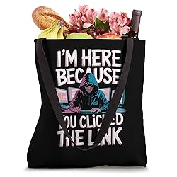 Hilarious hacker-themed design with a hooded figure and bold meme phrase “I’m Here Because You Clicked The Link” in digital-style typography. Perfect for cybersecurity pros, coders, and meme fans. Fun and edgy digital humor that plays on tech culture, programming, and online jokes. 16” x 16” bag with two 14” long and 1” wide black cotton webbing strap handles. Made of a lightweight, spun polyester canvas-like fabric. All seams and stress points are double-stitched for durability, and the reinforced bottom flattens to fit more items and hold larger objects. Spot clean/dry clean only.