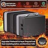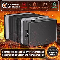 Fireproof&Heat Insulated Protection: The Upgraded fireproof document box is made of 15mm premium fire-retardant, non-itchy silicone-coated fiberglass, thickened fireproof aluminum foil and hard-shell material which can stands up against fire and passed the SGS TEST (UL-94 VTM-5VA / VTM-0 Burning Test). The 12-layer material protection of the important document organizer can withstand temperatures of up to 5200℉, completely protecting documents and valuables from fire damage Fireproof Zipper Protection: The upgraded fireproof metal zipper is made of high-strength metal teeth and flame-retardant wire,which can effectively block the flame and completely protect the files from being damaged.The box/bag has been carefully designed to withstand extreme environments and will keep your valuables safe and sound even after half an hour of burning.Choose a fireproof safe box that stands the test of time,it is the ultimate solution for protecting important documents,valuables Combination Lock Protection: Our fireproof document organizer can lock files and items inside the box for safety. High-quality password lock provides maximum security.The box is fireproof&Water-resistant,It ensures that files are protected in the event of fire,flooding,or humid weather, providing you with the reliability and peace of mind you need. Design with a strong grab handle for carrying everything you needed easily. The document box is suitable for business,travel,office,car,home storage Large Capacity & Multi-Compartment Storage: Exterior size is 15.5'' x 11.8'' x 5.12''. Internal size is 14.8'' x 10.6'' x 3.9''. Weighs 5lbs. This fireproof file organizer box/bag meets all your storage needs and comes with a removable Compartment. It can store your important documents, files, money, passport, U Disk, cards, laptop, certificates in a safe and orderly way. Great way to organize your files easy for you to find whatever files you looking for quickly Trusted After Sales Service: Nothing is completely foolproof, but added protection is always a good idea. In an emergency,our fireproof document box/bag ensures your files stay intact,giving you time to save your important documents. It is lighter,easier to carry than fireproof safes and quick to grab and go. We only wish to present the best to customers,to protect your valuables. If there any quality problem, please feel free to let us know. We are committed to solving your problem immediately