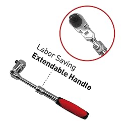 TELESCOPING DESIGN: Extends from 9.8 inches to 13.8 inches for versatile reach in tight spaces while maintaining maximum torque and control DRIVE SIZE: 3/8-inch drive with 72-tooth ratcheting mechanism provides precise control with 5-degree arc swing FLEX HEAD: Features adjustable head that pivots for multiple working angles, allowing access to hard-to-reach fasteners QUICK-RELEASE: Built-in quick-release button for easy socket changes and secure socket retention during use ERGONOMIC GRIP: Comfortable dual-material handle with non-slip design ensures secure grip and reduces hand fatigue