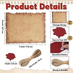 Vintage Design: this vintage scroll invitation set, including 100 sheets of vintage scroll paper and 100 self-adhesive foil stickers, blends retro charm with rustic warmth from the included string. Ideal for decorating or writing, it adds timeless elegance to every use. Ideal Dimensions: these aged scroll papers measure 5 x 7 inches/ 12.7 x 17.8 cm, while each sticker has a 1 inch/ 2.5 cm diameter. The string is 0.08 in/ 2 mm thick and 787.4 in/ 20 meters long, providing ample length for easy cutting and versatile use. High-Quality Materials: crafted from high-quality kraft paper, this antique scroll wedding invitation resists smudging with smooth ink adherence. Self-adhesive foil stickers feature unique designs, and the durable hemp rope ensures lasting use—ideal for all creative needs. Printing & Writing Friendly: durable and versatile, this vintage scroll paper is compatible with most inkjet, laser printers, and photocopy machines. It also ensures smooth handwriting without ink seepage, making it ideal for both printing and handwriting. Widely Used: this old birthday decoration paper makes a unique and romantic gift, ideal for special occasions such as Valentine’s Day, anniversaries, birthdays, and weddings. It’s also ideal for themed events like pirate parties, witch parties, magical witch themed gatherings, and Christmas invitations, adding a touch of vintage charm to any celebration.