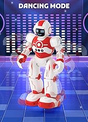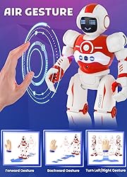 Remote Control and Hand Gesture Control:This gesture sensing robot not only can be controlled by infrared controller, but also can turn left ,turn right, slide backward, and slide forward according to how your hand gesture commands; Multi function includes auto display and obstacles avoidance as well;The toy robot’s eyes light up with bright blue illuminating LED when it moves Intelligent Programming: This smart robot toy can demonstrating a set of 50 actions inputted by the user.If you switch programming function,this Interactive robot will playback using its moves record feature to repeat the movement one by one as you created like turn left+turn right+walk forward+walk backward+patrol+dance+and many others action mode you selected Premium Material:This Remote Control Robot is made of non-toxic ABS plastic, with flexible multi-joint in shoulder,elbows and thumbs ,and the bottom skating wheels are pretty sturdy to well carry out a various combination of moves;This playful robot really entertain your kids and bring you endless joys Convenient Rechargeable Robot Toy:this RC robot is powered by built-in batteries.Directly connect to USB charging interface like your power bank,plug,computers.Rechargeable way saves your money for batteries and you only recharge the robot about 2 hours, and its playtime is about 60 minutes Ideal Birthday Xmas Gift & Kids Intimate Companion : The infrared control Robot is versatile and vivid can dance,sing,walk,patrol,even can speak.Each robot measures 5.9 x 3.3 x 10.6 inch.