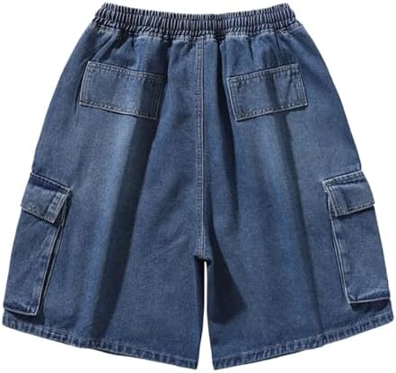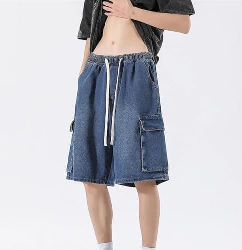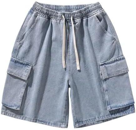 Men's Vintage Denim Shorts Outdoor Cargo Wide-Leg Pocket Elastic Waist Drawstring Jean Shorts