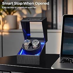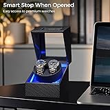 SUPERIOR CRAFTSMANSHIP: Watch winder box is meticulously handmade from premium materials like high-grade carbon fiber leather, MDF, and transparent large window acrylic glass for durability and a luxurious touch. Watch winder has a stop function when the cover is opened, which is more intelligent. The adjustable watch pillow can easily accommodate larger watches and also fits smaller women's watch bands 4 ROTATION MODES: Watch winders offers four modes to choose, providing professional care for your watch: Mode 1: rotate clockwise for 2 minutes, stop for 6 minutes, recycle; Mode 2: rotate counterclockwise for 2 minutes, stop for 6 Minutes, recycle; Mode 3: Rotate clockwise for 2 minutes, stop for 6 minutes; rotate counterclockwise for 2 minutes, stop for 6 minutes, recycle; Mode 4: clockwise for 5 minutes, rotate counterclockwise for 5 minutes, work for 3 hours and stop 9 hours ULTRA-QUIET WATCH WINDER: Watch winder case is equipped with a premium silent Japanese mabuchi motor that features high torque, precise control, low power consumption, and long lifespan. Watch rotator operates at an extremely low noise level of less than 5dB, which means watch winder can work quietly anywhere without disturbing you, even at night, ensuring that you and your family can rest undisturbed DUAL POWER SUPPLY: Rotating watch case comes with two charging options: it can be powered by an type-C 5V AC adapter (included in the package) or by batteries (not included). Please note: do not use both AC power and battery power simultaneously. When using the AC power adapter, please remove the batteries.The Type-C interface is versatile and compatible, and can be powered by mobile power supplies, laptops, mobile phone chargers, etc PRESENTATION BOX: Presented in a presentation box, Dual watch winder is the ideal present for birthdays, Valentine's Day, weddings, anniversaries, Christmas, or Father's Day. Whether for a husband, father, or friend, it will satisfy even the most discerning recipient AFTER-SALES SERVICE: BEWISHOME watch winder offers 24-hour email customer service. If you encounter any issues during use, please feel free to reach out to us, and our dedicated support team will provide professional assistance to ensure your satisfaction