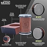 - SKÄR Knife Sharpener Kit: Our tummbler rolling knife sharpener kit combines function and elegance, making it a perfect addition to any kitchen. Featuring powerful magnetic knife sharpener angle guide supports on both sides of the base, this roller sharpener for knives provides superior stability and precision for a sharp tool. Constructed from durable solid wood, the rolling knife sharpener tool enhances longevity while adding a touch of sophistication. It includes two diamond discs with varying levels of coarseness, allowing users to sharpen a wide range of knives with ease. Ideal for home cooks who value convenience and style, it keeps knives sharp and ready. Its premium design and packaging also make it a thoughtful gift for cooking enthusiasts. Measuring 4.25"L x 4.25"W x 3.4"H, the portable knife sharpener is a stylish and practical choice for both personal use and gifting. About Us: SKÄR is a small, family-owned business. We love designing convenient and thoughtful products that you can use in your daily life. This kitchen tool is an effort to do just that. We hope you love our tumbler sharpener kit as much as we do. Thanks for supporting our family business!