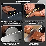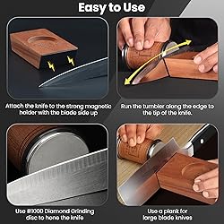 Knife Sharpening Kit : Our knife sharpener rollers are kitchen tools thoughtfully designed with powerful knife magnet supports on both sides of the base, providing unmatched stability and precision during sharpening Versatile Diamond Discs: These knife sharpeners come with two diamond grinding discs with different levels of coarseness; this roller knife sharpener is a perfect blade sharpener for sharpening a wide range of knives, from chef's knives to paring knives to pocket knife sharpener Durable Solid Wood Construction: Crafted from premium solid wood, this rolling sharpener for knives not only looks elegant but is built to last, making it a durable addition to your kitchen appliances Compact and Convenient: Measuring 4.25"L x 4.25"W x 3.4"H, this chef knife sharpener fits easily in any kitchen drawer or countertop; enjoy the convenience of sharpening your knives at home with this tool sharpener that looks great and gets the job done Perfect Gift Option: Packaged in a premium box, this knives sharpener is an ideal gift for cooking enthusiasts; the stylish design and practical function of this professional knife sharpener make it a thoughtful present for any occasion