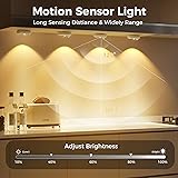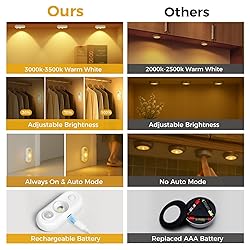 Motion Sensor Light Indoor: This LED cabinet lights feature versatile operating modes. When set to motion sensor mode, the under cabinet lights turn on automatically upon detecting human movement within 120° and 10ft in dark or low-light settings. They turn off after 30 seconds of inactivity. No more stumbling in the dark or searching for switches at night Dimmable Closet Lights: Illuminate your space precisely with our rechargeable closet lights. 3000k-3500k (Warm White) emit a bright, soft, non-dazzling white light of up to enjoy tailor-made brightness levels ranging from10% to 100% USB Rechargeable Puck Lights: The under cabinet light is powered by a built-in 400mAh rechargeable battery. (Tip: USB cable included) When fully charged, it can last up to 30 days in motion sensing mode (based on low-frequency usage; actual battery life varies by usage frequency), and can work continuously up to 10 hours in constant light mode Easy Installation: These wireless LED motion sensor lights indoor with built-in strong magnets, allowing them to be adsorbed directly on ironwork surfaces. Or use the included adhesive metal plates to stick on anywhere you want. That also means it’s easy to take off and put back on when it needs a charge Multiple Application Cabinet Light: The motion sensor puck lights are a friendly nighttime assistant, which is good for many people afraid of the dark. LED night lights indoors are widely used for bedrooms, counters, kitchens, garages, showcases, basements, closets, stairs, hallways, cupboards, etc