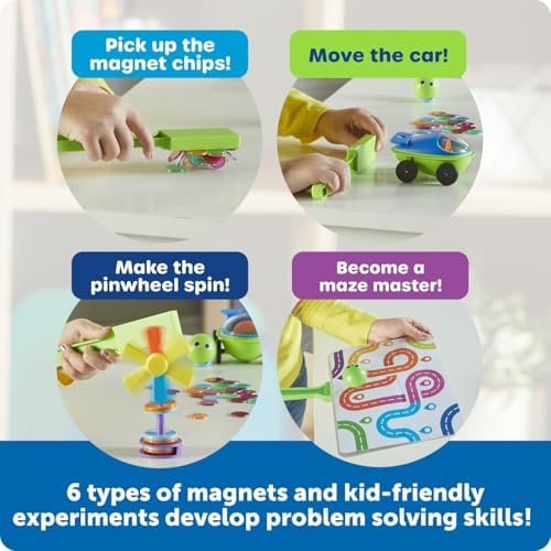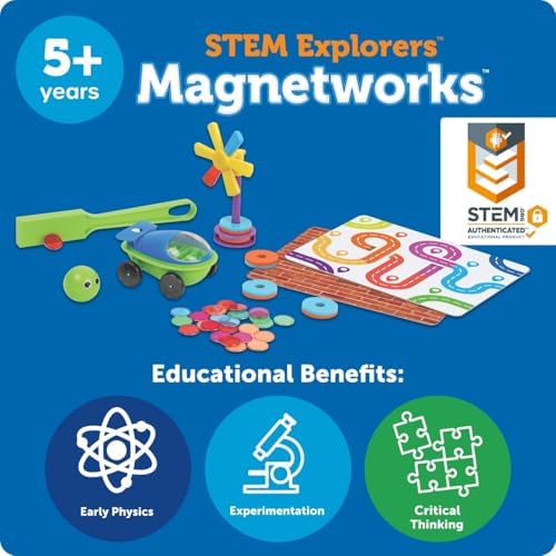 he Learning Resources STEM Explores Magnetworks kit is a 46-piece science set designed to make magnetism fun, safe, and hands-on for kids ages 5–8. With a colorful 20-page activity guide and 14 engaging experiments, children can explore magnetic force by making a car move without touching it, spinning a pinwheel, levitating discs, and more. The open-ended design encourages creativity and problem-solving, making it ideal for both solo play and small group activities. While the kit includes one magnetic wand, it's well-suited for 1–3 children to use together—whether they take turns, collaborate on experiments, or explore different activities in parallel. Teachers and parents will appreciate the classroom-friendly layout, which supports science centers, homeschool lessons, and hands-on demos. The experiments are varied enough to appeal to different age groups, with younger kids benefiting from adult guidance and older kids enjoying independent discovery. The components are made from durable, wipe-clean plastic and include magnetic discs, chips, a wand, a magnetic ball, and more. Some reviewers noted that the pinwheel can be tricky to spin and maze stickers are single-use, but these challenges offer opportunities for creative problem-solving. The strong magnets require finesse, helping kids learn how positioning affects magnetic force. Whether used at home or in a classroom, Magnetworks is a screen-free, battery-free way to nurture curiosity and introduce STEM concepts through play. It's more than a toy—it's a launchpad for learning.