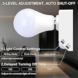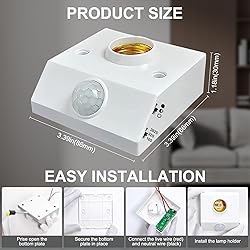 - Effortless, Energy-Efficient Lighting with Motion Sensor Light Socket – Ideal for Stairways, Hallways, and MoreThe motion sensor light socket is designed to provide efficient, hands-free lighting by automatically turning the light on when motion is detected and off after a delay. Ideal for high-traffic areas like stairways, hallways, garages, courtyards, and warehouses, this dusk to dawn light socket ensures convenient lighting without manual operation, saving energy and improving security.Key Features:Automatic Motion Detection: The screw-in motion sensor light socket detects movement and automatically activates the light, turning it off after a delay. Perfect for areas such as staircases, corridors, and garages, this intelligent lighting solution saves power and adds convenience.Wide Compatibility: This dusk to dawn socket is compatible with E26/E27 screw-in bulbs, including LED and energy-saving bulbs. Easily upgrade your existing lamp holder light socket with this dusk to dawn light socket adapter—no need for complex wiring, just a simple manual connection.Effective Motion Range: The light sensor socket offers a 120° detection angle with a range of 2-6 meters, ensuring optimal performance. Install the sensor facing the direction of movement for reliable detection and efficient operation.Multiple Light Modes: Choose between three lighting modes: "Dark Mode" for total darkness, "Dusk Mode" for low-light conditions, and "All-Day Mode" for 24/7 motion detection. Ideal for spaces like garages, hallways, or other areas lacking natural light, the dusk to dawn light socket offers flexible lighting solutions.Customizable Delay Settings: Set the light-off delay to suit your needs: 16 seconds for quick passage, 36 seconds for regular use, and 262 seconds for continuous lighting. The light socket motion sensor adapter provides adjustable functionality based on your specific requirements.Electrical Specifications: This motion sensor light socket supports a maximum wattage of 60W, with a voltage range of AC 100V-240V. To ensure safety and performance, avoid using bulbs over 60W and follow proper installation instructions.Quality Assurance: This light sensor socket is built with industry-standard quality, and has a factory defect rate of 5%. If you experience issues with the sensor, please contact us for a replacement. Proper installation ensures the longevity and optimal function of your lamp holder light socket.