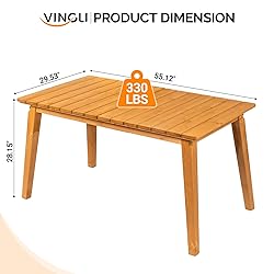Spacious & Ergonomic Design: Measuring 55.12"L x 29.53"W x 28.15"H, this rectangular patio table comfortably seats 4-6 people. The A-frame legs provide enhanced stability while maintaining a minimalist farmhouse aesthetic. 100% Solid Cedar Wood: Constructed from premium solid cedar wood, known for its weather resistance and durability. The oil-finished surface prevents cracking and extends lifespan. Scientific Reinforcement: The outdoor wooden dining table features a triangular A-leg structure and reinforced joints, providing superior stability and a weight capacity of 200 lbs. The solid cedar wood construction ensures long-lasting durability, making it perfect for patio, garden, or backyard use Practical Detailing: Slatted tabletop promotes drainage to prevent water pooling. Rounded edges and sanded smooth surfaces ensure safety. Easy Assembly & Care: Includes step-by-step instructions with pre-drilled holes for quick installation. For maintenance, simply wipe clean and apply wood oil annually.