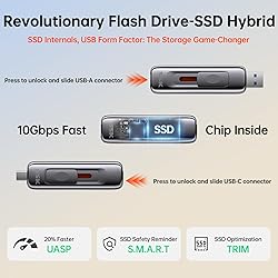 Blazing 10Gbps Reliability: This revolutionary thumb drive–SSD hybrid integrates external ssd into an ultra-portable USB flash drive form factor, delivering transfer speed up to 1000MB/s for fast viewing, editing, and backup. Note: Actual speed varies based on host device, USB 3.2 Gen2 interface, and file type Push-Pull Dual-Interface: Switch between the portable ssd built-in USB-A and USB-C connectors for easy connection to phones, tablets, laptops, and desktops—no adapters required. Ideal usb drive for fast file transfers between mobile devices and computers. Note: iPhone requires iOS 17 or later and USB-C Pro models for full-speed transfer NAND SSD Chip: SSD external hard drive equipped with SMART checking and TRIM optimization, this SSD flash drive delivers stable long-term performance under heavy workloads. Perfect for reliable file management, high-frequency transfers, and data backup. Note: Always safely eject the usb drive to maintain data integrity Zinc Alloy Cooling: The premium zinc alloy casing dissipates heat up to 30% faster than plastic, ensuring consistent usb SSD performance during extended high-speed transfers while enhancing endurance. Note: The flash drive case may warm up during continuous transfers; this is normal and safe 4K ProRes HDR for iPhone: Capture 4K 60Hz ProRes HDR videos directly to the USB drive on supported iPhone and Android OTG devices, bypassing internal storage limits. A powerful portable ssd external hard drive for mobile creators. Note: Requires compatible iPhone Pro USB-C models; Android devices must support OTG and 4K recording Universal Compatibility: USB flash drives built to USB 3.2 Gen2 standard and backward compatible with older USB interfaces, this USB drive works plug-and-play on most phones, tablets, computers, and USB-enabled hardware. Pre-formatted as exFAT for universal use. Note: Some phones with limited power output may require external power source Full 2TB Massive Storage Capacity: 2tb flash drive shows about 1907GB on Windows and 2TB on macOS due to different calculation methods. This variation in displayed capacity comes from algorithmic differences where Windows counts 1GB as 1024MB while SSD systems count 1000MB