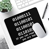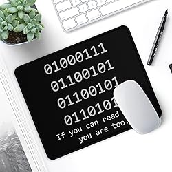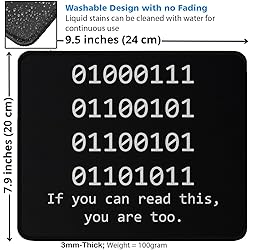 - Show off your tech-savvy side with this clever binary code mousepad featuring the message 'If you can read this, you are too' encoded in binary. Perfect for programmers, developers, and computer enthusiasts, this black gaming mousepad combines style with functionality. Measuring 9.5 x 7.9 inches with a 3mm thickness, it provides ample space for smooth mouse movement. The dense anti-slip rubber base keeps the pad firmly in place during intense coding sessions or gaming marathons. Built with durability in mind, this mousepad features reinforced edges to prevent fraying and a washable surface that resists staining - simply clean with water when needed. At 100 grams, it's substantial enough to stay put while remaining portable. The crisp white binary text on the black background creates a sleek, minimalist aesthetic that will complement any desk setup while showing off your coding credentials.