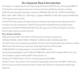 - Introduction ESP32-P4-WIFI6-DEV-KIT Development Board, Based On ESP32-P4 and ESP32-C6. It features rich Human-Machine interfaces, including MIPI-CSI (with integrated Image Signal Processor), MIPI-DSI, SPI, I2S, I2C, LED PWM, MCPWM, RMT, ADC, UART, TWAI, etc. Additionally, it supports USB OTG 2.0 HS, Ethernet port and SDIO Host 3.0 for high-speed connectivity. The ESP32-P4 chip integrates the Digital Signature Peripheral and a dedicated Key Management Unit, ensuring secure data and operations. Specifically designed for high-performance and high-security applications, the ESP32-P4-WIFI6-DEV-KIT meets the requirements of Human-Machine interaction, efficient edge computing, and IO expansion. Supports AI Speech Interaction: Allows access to online large model platforms such as DeepSeek, ChatGPT, etc. Reserved PoE Module Header: More Flexible for Power Supply. Connect to a PoE Module for PoE Power Supply: Provides Both Network Connection And Power Supply for ESP32-P4-WIFI6-DEV-KIT board with Only One Ethernet Cable. Powerful image and voice processing capability. Provides image and voice processing interfaces including JPEG Codec, Pixel Processing Accelerator, Image Signal Processor, H264 encoder. Commonly used peripherals such as MIPI-CSI, MIPI-DSI, USB 2.0 OTG, Ethernet, SDIO 3.0 TF card slot, microphone, speaker header and RTC battry header, etc. 6. Security features: Secure Boot, Flash Encryption, cryptographic accelerators, and TRNG. Additionally, hardware access protection mechanisms help to enable Access Permission Management and Privilege Separation. WiFi 6 and Bluetooth module: Onboard ESP32-C6 chip to extend 2.4GHz Wi-Fi 6 and Bluetooth 5/BLE for ESP32-P4-WIFI6-DEV-KIT, using SDIO interface protocol for communication, stable connection and efficient transmission. Package Content ESP32-P4-WIFI6-DEV-KIT-B Includes 14 items