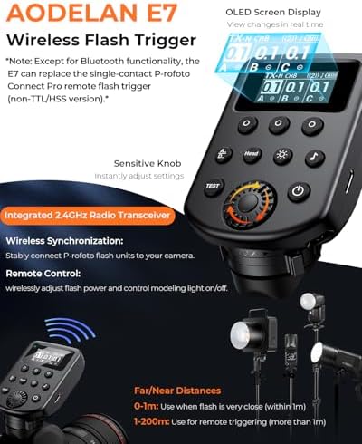 - AODELAN E7 Wireless Flash Trigger is compatible with Profoto's Air system. Flashes using the Air 2 or Air 1 protocol offer 100 channels and real-time E7 display power monitoring, including the A2, A10, B10, B10 Plus, B10X, B10X Plus, B20, B30, D2, D2 Industrial, D30, Pro-D3, Pro-B3, and Pro-11. Earlier models operating solely on the classic Air 1 protocol use channels 1–8 or 1–20, such as the A1X, B1, B1X, B2, C1 Plus, D1, and Pro-10.