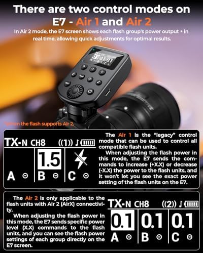 - Dual-Mode Wireless Flash Trigger :Easily adjust your lights for Profoto with smooth switching between Air1 and Air2 modes. Switch between Normal (TX-N) and Fast (TX-F) modes. TX-F mode offers low 136us latency for high-speed sync up to 1/250s, while TX-N extends battery life with 460us latency. Remotely control flash power, modeling light, and turn lights on/off. The clear OLED screen provides real-time system monitoring to help you work efficiently and maintain consistent lighting, even with multiple lights.