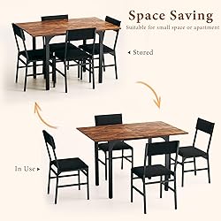 5-Piece Dining Table Set: This set comfortably seats 2-4 guests, which includes a foldable dining table, and 4 chairs. The woodgrain tabletop style and the black frame's clean lines make dining table a versatile addition to the kitchen, dormitory, living room, study room, office and meeting room. Extendable Dining Table for Flexible Space: The kitchen table can be rotated and flipped to extend when you need the extra space. When not in use, gently push the stool into the area under the dining table, giving you more room to move around. Upgraded Upholstered Chairs: The kitchen table chairs set of 4 features soft fabric upholstered seats that exude comfort and elegance, creating a welcoming and inviting seating experience for the modern dining table. Sturdy & Durable: High-quality MDF board is used in this black dining table set, which is waterproof and scratch-resistant; it can be easily cleaned with a sponge and water. The sturdy steel frame and triangular triangular structure provide strong support and stability for the dining table set for 4. Functional & Easy Assembly: You can use kitchen table chairs set of 4 as an addition to your patio dining table, computer desk, study desk, office desk and breakfast nook. Easy assembly with detailed installation manual and organized packaging.MDF made of FSC-Certified wood