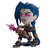 - Jinx storms into Youtooz with a thunderous, chaotic entrance! Standing 4.3 inches tall, she's poised mid-fire, a pink hailstorm erupting from her gatling gun. Her dark brows knit over vibrant pink eyes, blue hair cascading in a thick fringe and long ponytails. Clad in a black top, purple striped pants, and sturdy boots, swirling blue tattoos adorn her midriff and right arm. Her packaging bursts with pink and blue scrawls on a dark backdrop, spilling into the smudged interior. A dark blue sleeve with a golden frame showcases her figure through a clear window. This collectible arrives in a matte, embossed outer sleeve and a custom plastic protector for secure shipping.