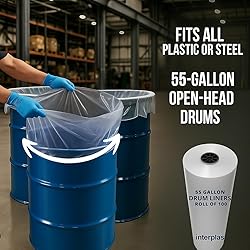 - Interplas 55-Gallon Drum Liners in 3 mil thickness are a lightweight, cost-effective solution for lining barrels used in dry storage or light-duty applications. Measuring 38″ x 65″, they offer full coverage for 55-gallon drums with enough length to fold securely over the rim. These BPA-free polyethylene liners are frequently used to protect dry goods such as grains, animal feed, food mixes, or prepping supplies from contamination or moisture. The 3 mil thickness allows for easier handling while still providing a clean barrier. Packaged in a 100-count coreless roll, they strike the right balance between strength and flexibility for farms, commercial storage, and emergency readiness setups.
