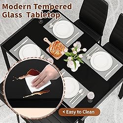 COMFORTABLE & ELEGANT: Chairs with ergonomic support and a mid-century modern design make this stylish and comfortable dining room table set for 4 perfect for kitchen or dining areas. MODERN & SPACE-SAVING: A modern dining table set for 4 with a sleek, space-saving design, ideal for small kitchens or dining rooms. Chairs slide neatly under the table when not in use. UPGRADED COMFORT: This 5-piece dining set includes a rectangular glass kitchen table and 4 faux leather chairs with cushioned seats, offering comfort and support for everyday meals. EASY TO CLEAN: The smooth glass tabletop and PU leather seats wipe clean quickly, making this dinner table for 4 easy to maintain, helping you keep your dining area fresh, tidy, and mess-free. QUICK ASSEMBLY: This dining room table set comes with all the hardware and a clear manual. Every part is numbered to make putting it together quick and hassle-free, even if you’re not a pro.