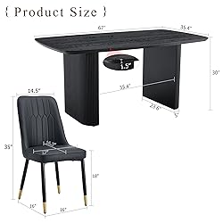 Spacious Modern Dining Table Set: With its 67'' x 35.4'' oval-shaped top, this black oval dining table set comfortably seats 6 people, optimizing your dining area while maintaining a sleek look—ideal for daily meals or special occasions 3.5'' Thick Top for Lasting Strength: Built with a durable 3.5'' thick tabletop, this dining table and chairs set of 6 resists bending or wobbling over time. Rounded corners add safety, making this black kitchen table set ideal for families with children Reliable Support and Everyday Durability: Crafted from premium timber and metal, the table supports up to 300 lbs of meals and décor, while each chair holds up to 250 lbs. Even when kids move around or climb on it, the modern dining table set for 6 remains steady and safe. Easy to Clean and Assemble: The smooth, seamless tabletop resists stains and scratches, while the faux suede chairs are easy to wipe clean after daily use. This modern dining table and chairs includes clear instructions and all necessary tools, allowing for quick assembly in just 30 minutes Matte Black Dining Table Set for 6: The sleek black wood-patterned surface paired with a Roman column base and 6 metal-legged chairs, creates a modern aesthetic. This 7 piece dining table set is perfect for cozy family meals and can also suit a more formal dining or meeting space