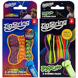 - Upgrade your playtime with the ZipString Chameleon & Psycho Strings Bundle Pack, the ultimate accessory set for your ZipString rope launcher toy. This 6-pack includes 3 Chameleon Strings and 3 Psycho Strings, giving you a mix of glow-in-the-dark, UV reactive, and color-changing replacement ropes designed for kids, teens, and adults. The Chameleon Strings create a stunning optical illusion with vibrant red, blue, and yellow segments that visually blend into new colors while in motion. Perfect for fidget play, tricks, and STEM fun, they deliver a mesmerizing display that captivates every audience indoors or outdoors. The Psycho Strings take play to the next level with insane neon color combinations and UV reactive glow-in-the-dark effects. Watch as lightning patterns and glowing trails follow every move, making your ZipString toy stand out during day or night play, parties, fidget sessions, and outdoor activities. Each replacement rope is crafted from durable, high-quality materials for smooth performance and long-lasting use. They are designed for quick and easy attachment to your ZipString, so kids and adults can swap strings in seconds and enjoy nonstop fun anytime. This bundle is Shark Tank featured, created by the innovative team behind ZipString. Known for exciting fidget ropes, STEM-based play, and high-quality rope launcher toys, ZipString brings creativity, science, and fun together in one unique interactive toy experience. The bundle pack makes an excellent gift for birthdays, holidays, or any occasion. Whether you are looking for STEM toys for kids, fidget gadgets for teens, glow-in-the-dark party toys, or stress relief ropes for adults, this set offers something exciting for everyone. Take your ZipString tricks to the next level with the Chameleon & Psycho Strings Bundle Pack. Add glowing color, lightning effects, and optical illusions to every spin, and experience why ZipString is one of the most exciting toys of the year.